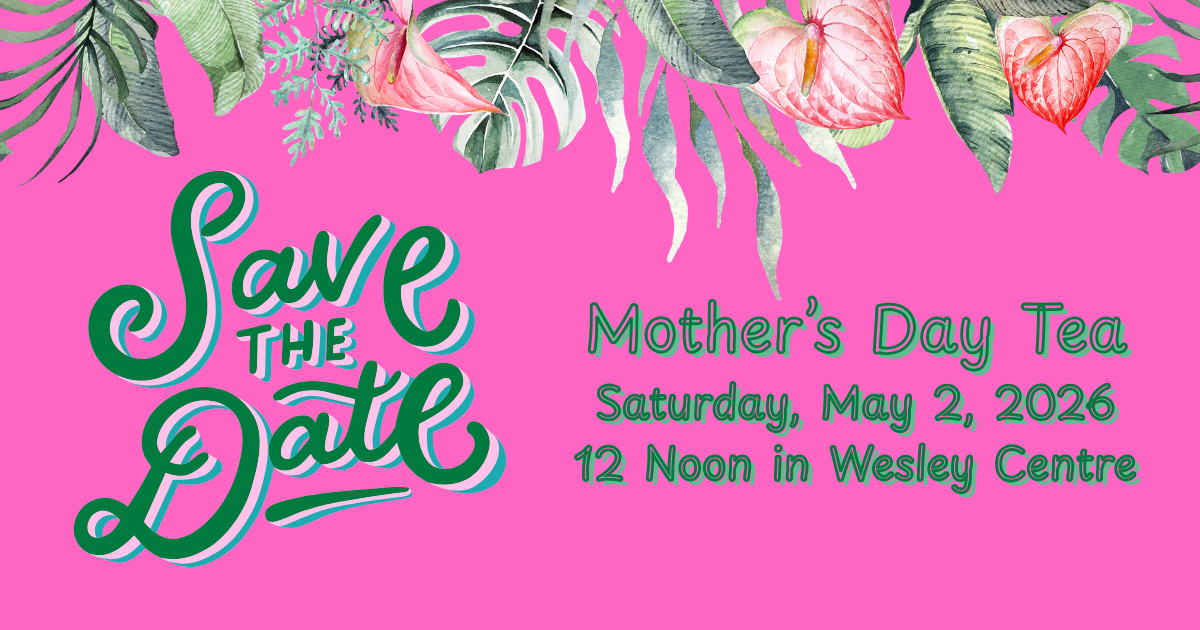Mark your calendars for our annual tea, scheduled for Saturday, May 2nd at 12 noon in the Wesley Centre. Interested in hosting a table? Contact Erin Washom through the church office or watch your bulletin for more details.